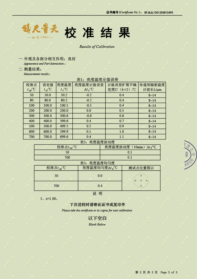 上一條:低溫浴式黑體輻射源(-55-80℃)校準(zhǔn)證書(shū) | 下一條:超低溫面源黑體爐(-40-80℃)校準(zhǔn)證書(shū) |