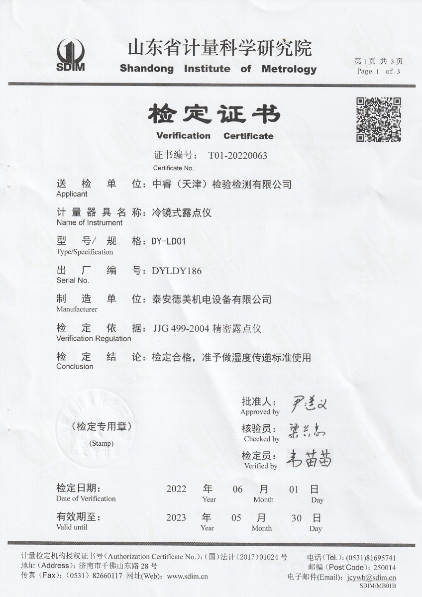 上一條:中睿(天津)檢驗(yàn)檢測(cè)有限公司-冷鏡式露點(diǎn)儀校準(zhǔn)證書(shū) | 下一條:超低溫面源黑體爐(-40-80℃)校準(zhǔn)證書(shū) |