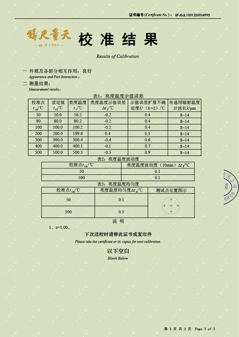 黑體輻射源(50-500℃)校準證書 2025-9-12 本文被閱讀 1055 次