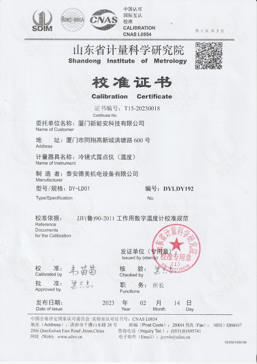 上一條:廈門新能安科技有限公司 冷鏡式露點(diǎn)儀 檢定證書 | 下一條:便攜式干體爐(-30-150℃)校準(zhǔn)證書 |