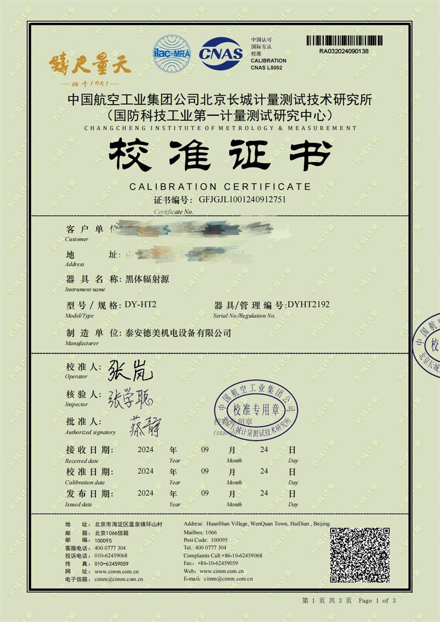 黑體輻射源(50-500℃)校準(zhǔn)證書(shū) 2024-10-17 本文被閱讀 5246 次