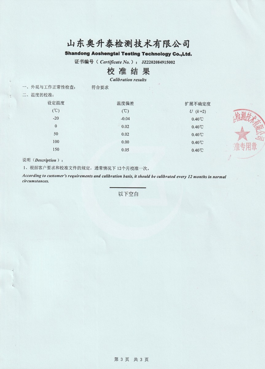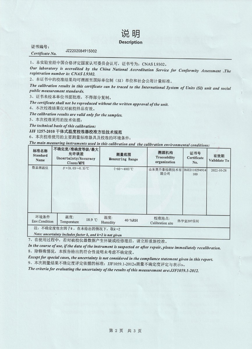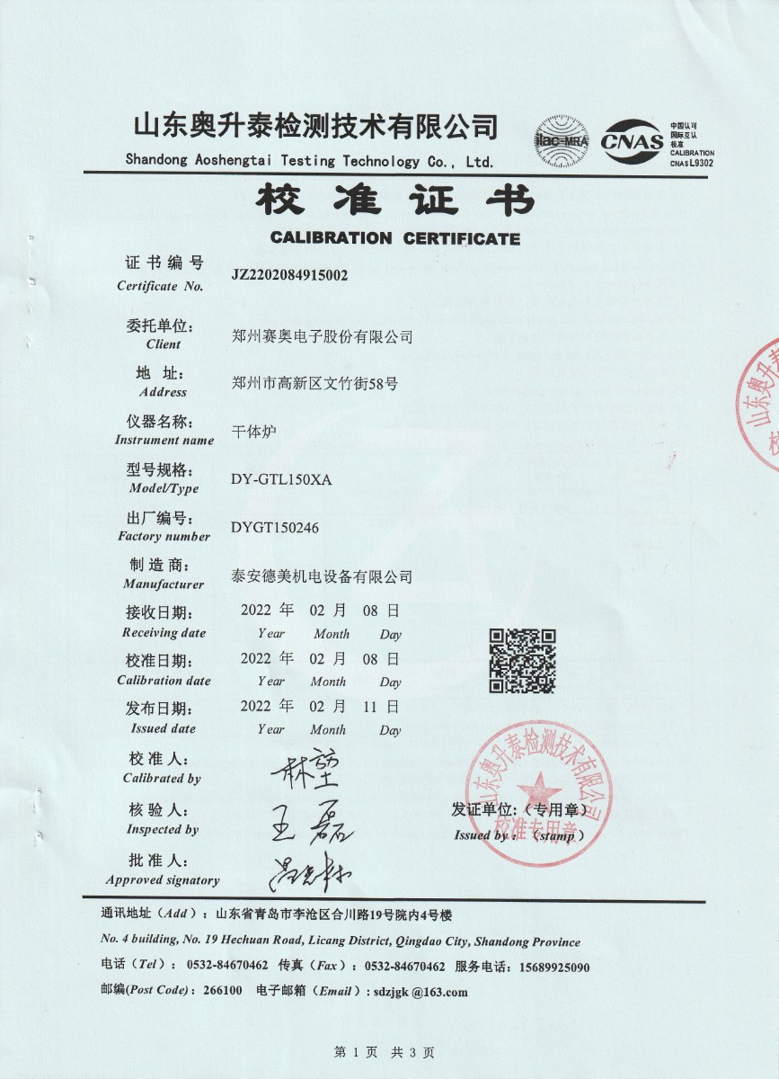 上一條:鄭州賽奧電子股份有限公司-干體爐DYGT150245 | 下一條:便攜式干體爐(-30-150℃)校準(zhǔn)證書 |