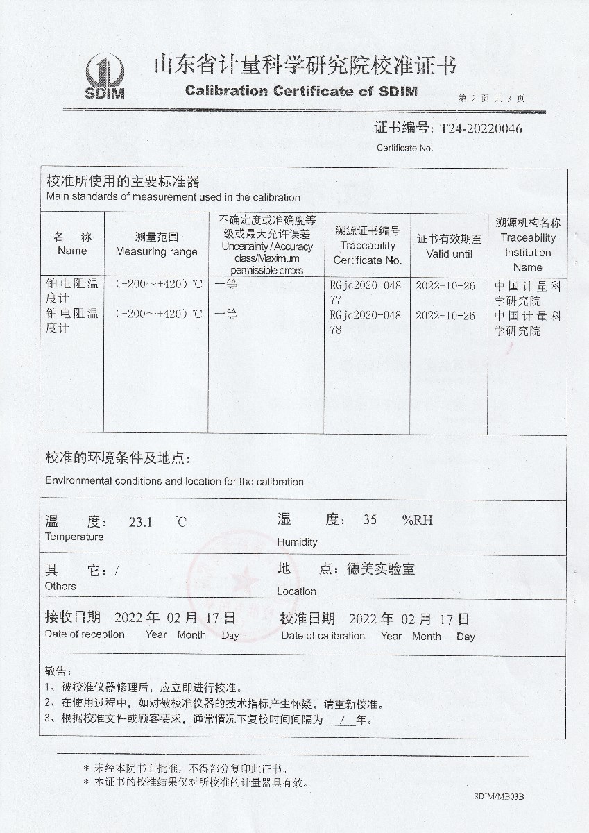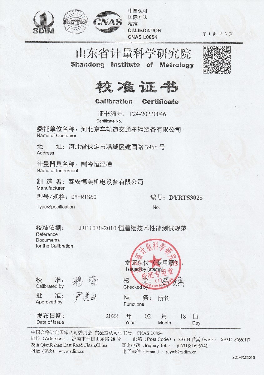 上一條:河北京車軌道交通車輛裝備有限公司-熱電偶檢定爐 | 下一條:超低溫面源黑體爐(-40-80℃)校準(zhǔn)證書 |
