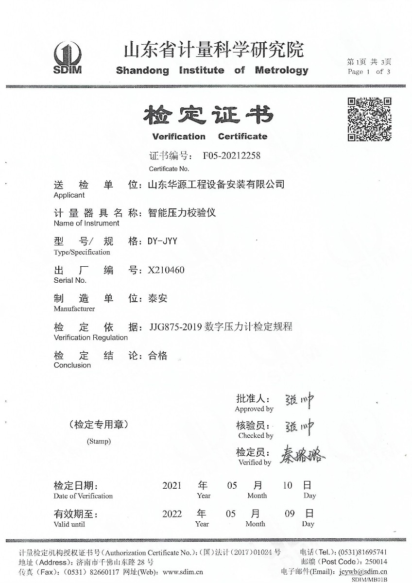| 上一條:山東華源工程設(shè)備安裝有限公司-智能壓力校驗(yàn)儀X210459 | 下一條:便攜式干體爐(-30-150℃)校準(zhǔn)證書 |